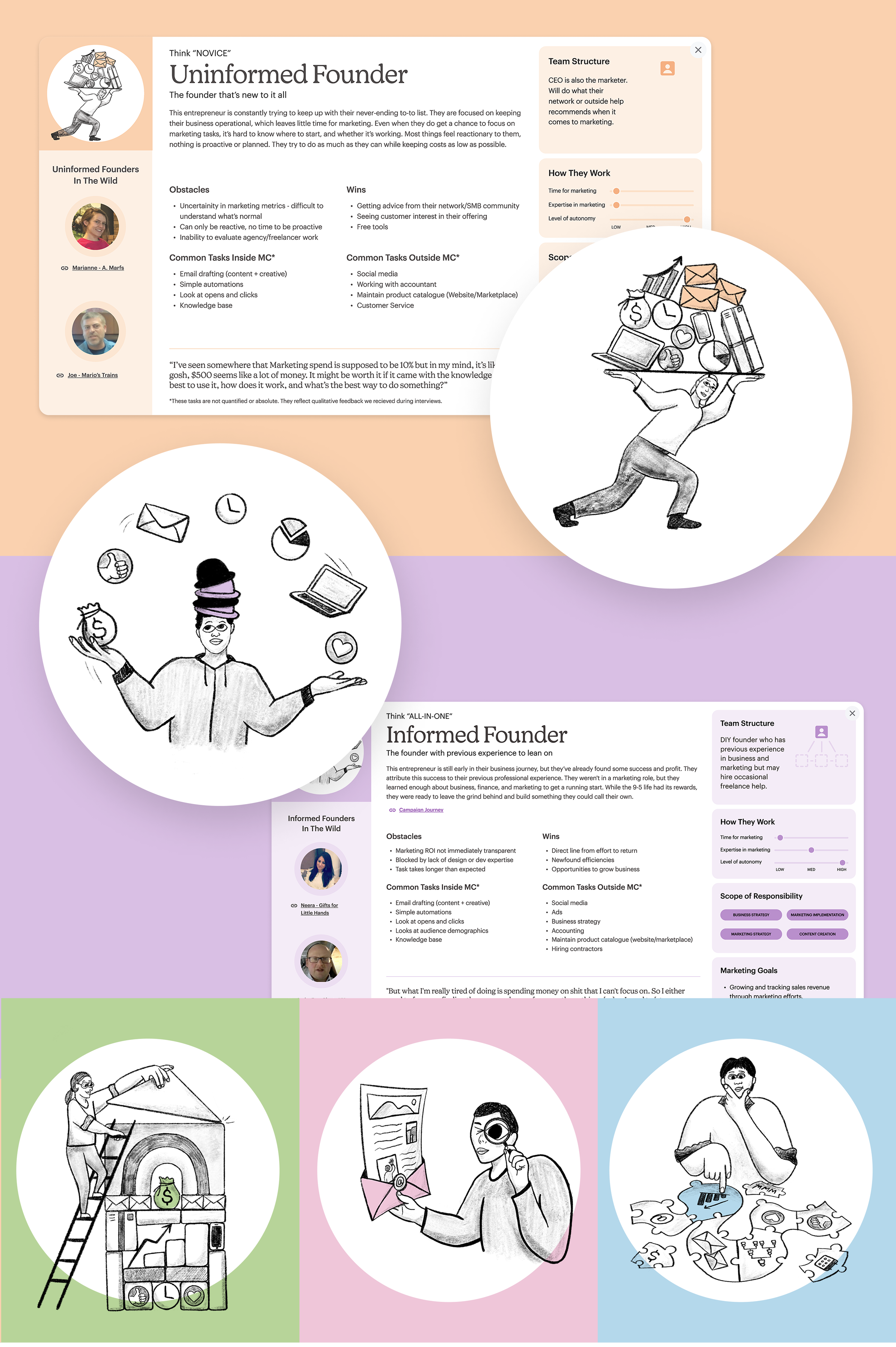 These illustrations and one-pagers provided an at-a-glance way for internal teams to connect with user needs, helping to guide decision-making across design, marketing, and product development.